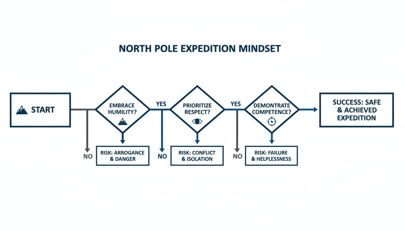 This flowchart maps out the core mindset for travelling safely in polar bear country. It’s a philosophy that starts with humility, builds into respect, and results in real-world competence.